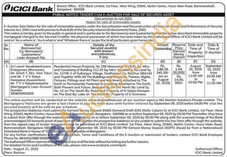Residential House Property No 296 Measuring 1719.91 Sq. Mtrs. and Consisting of Building 112.20 Sq. Mtrs. Situated in Na Land Sy. No. 127/8-2 of Sultanpur Village, Sindhanoor Ta, Raichur-584143 and Together With All The Buildings and Structures Thereon, Rights, Fixtures, Fittings and All Plant and Machinery Attached to The Earth or Permanently Fastened to Anything Attached to The Earth, Both Present and Future. Bounded By:on The North By: Land Sy No. 12 on The South By: Road and Property of N Satya Narayan on The East By: Lake on The West By: Property of G Srinivasa