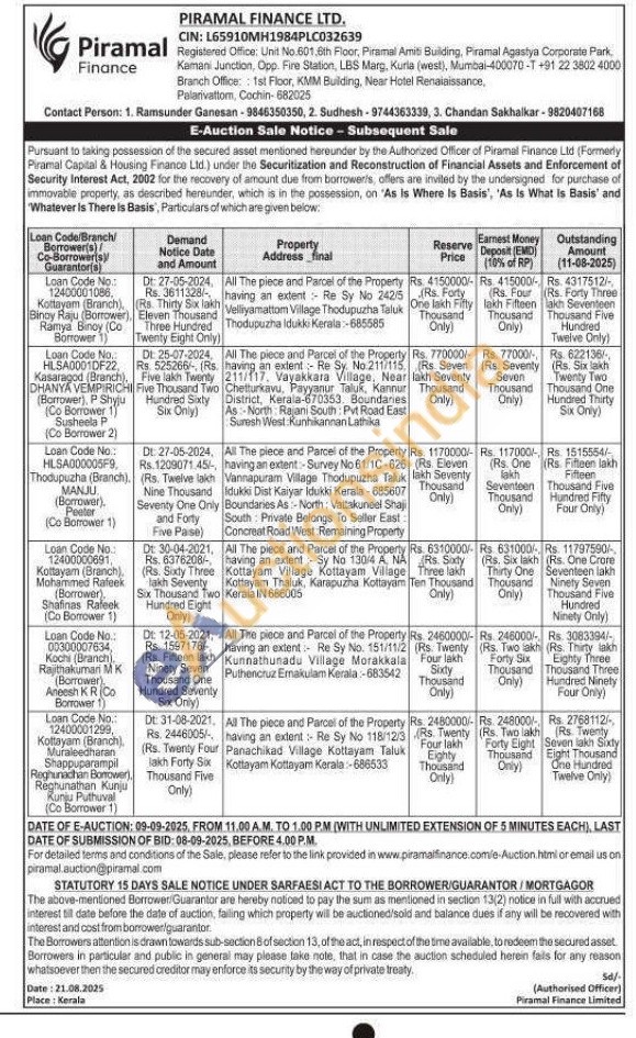 2) All The piece and Parcel of the Property having an extent Re Sy. No 211/115, 211/117, Vayakkara Village, Near Chetturkavu, Payyanur Taluk, Kannur District, Kerala-670353. Boundaries As North Rajani South: Pvt Road East Suresh West Kunhikannan Lathika