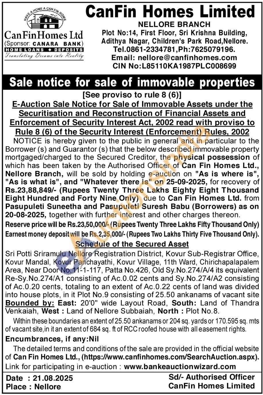 Schedule of the Secured Asset Sri Potti Sriramulu Nellore Registration District, Kovur Sub-Registrar Office, Kovur Mandal, Kovur Panchayathi, Kovur Village, 11th Ward, Chirichapalapalem Area, Near Door No. 11-1-117, Patta No.426, Old Sy. No.274/A/4 its equivalent Re-Sy.No.274/A1 consisting of Ac.0.02 cents and Sy.No.274/A2 consisting of Ac.0.20 cents, totaling to an extent of Ac.0.22 cents of land was divided into house plots, in it Plot No.9 consisting of 25.50 ankanams of vacant site Bounded by: East: 20'0" wide Layout Road, South: Land of Thandra Venkaiah, West: Land of Nellore Subbaiah, North: Plot No.8.