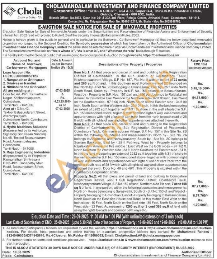 Item No.1: All that piece and parcel of land and building in the Registration District of Coimbatore, In the Sub District of Coimbatore Taluk. Krishnarayapuram Village, S.F. No. 157, Plot No. II with an extent of 22 cents and 265 sq.ft of land, in this Southern most Portion marked 2C bounded on the: North by Plot No. 28 belonging to Chinnasamy, East by-25 It wide North South Road, South by Property in S.F. No. 158 belongs to Balasundaram. West by-Property in S.F. Nos. 157 part and 156 part belongs to Rajalakshmi Ammal. In this middle East West on the Northern side-97 ft 06 inch, East West on the Southern side-97 ft 06 inch, North South on the Eastern side-34 ft 00 inch, North South on the Western side-33 ft 04 inch, in this the land measuring an extent of 3282 sq.ft together with 4/31 th share in the well situated in S.F No. 153 mentioned above, together with common right of way, easements and appurtenances with right of user of cart track from the north to south road of 25 width with all rights of way and other appurtenances attached therewith.ft Item No.2: All that piece and parcel of land and building in the Registration District of Coimbatore. In the Sub Registration District of Peelamedu, Coimbatore Taluk, Krishnarayapuram Village, S.F. No. 157 in this Site No. 28 within the following boundaries and measurements: North by Site No. 2A belongs to Angammal and Narayanasamy, South by Site No. 2C belongs to Somam Baskaran, East by 25 It Pathway, West by Property belongs to Rajalakshmi Ammal. In this middle East West on the Both sides-97 1/2 ft. North South on the Western side-33 ft, North South on the Eastern side-34 ft. In this the land measuring an extent of 3282 sq.ft together with 4/31 th share in the well situated in S.F. No. 153 mentioned above, together with common right of way, easements and appurtenances with right of user of cart track from the north to south road of 25 ft width with all rights of way and other appurtenances attached therewith. Door No. 49 and 49/1. This Property is situated within the Coimbatore Corporation limits,