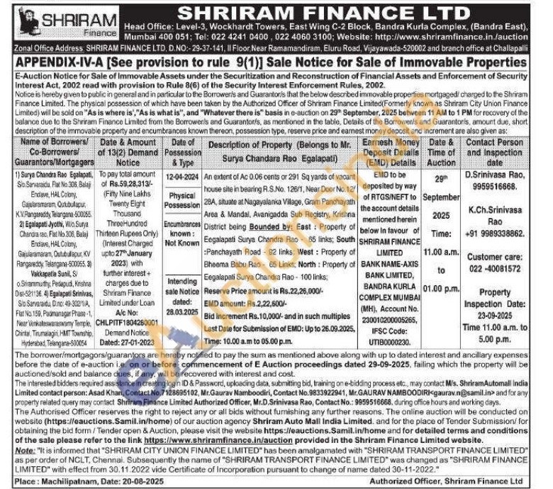 An extent of Ac 0.06 cents or 291 Sq yards of vacant house site in bearing R.S.No. 126/1, Near Door No.12 28A, situate at Nagayalanika Village, Gram Panchayath Area & Mandal, Avanigadda Sub Registry, Krishna District being Bounded by: East: Property of Eegalapati Surya Chandra Rao 65 links; South Panchayath Road 92 links: West: Property of Bheema Babu Rao 65 Links: North Property of Eegalapati Surya Chandra Rao-100 links: