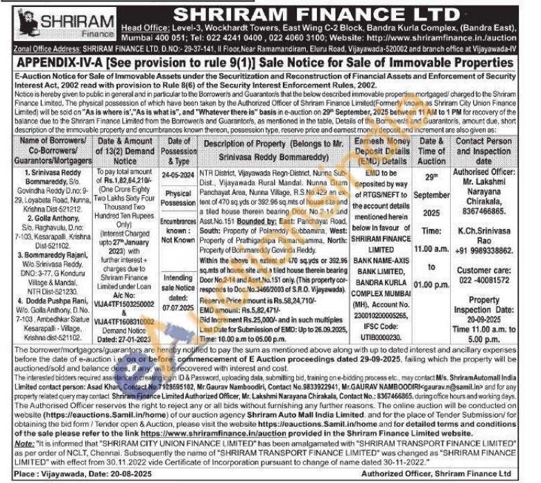 NTR District, Vijayawada Regn-District, Nunna Sub-Dist., Vijayawada Rural Mandal. Nunna Gram Panchayat Area, Nunna Village, R.S.No.429 an ex-tent of 470 sq yds or 392.98 sq.mts of house site and a tiled house therein bearing Door No.2-14 and Asst. No. 151 Bounded by: East: Panchayat Road, South: Property of Polareddy Subbamma, West: Property of Prathigadapa Ramanujamma, North: Property of Bommareddy Govinda Reddy. Within the above an extent of 470 sq.yds or 392.96 sq.mts of house site and a tiled house therein bearing Door No.2-14 and Asst.No. 151 only. (This property cor-responds to Doc. No.3466/2003 of S.R.O. Vijayawada).
