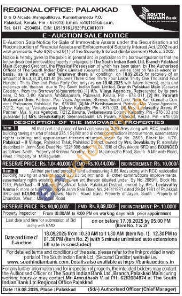 All that part and parcel of land admeasuring 3.20 Ares along with RCC residential building having an area of about 235.1 Sq Mtr and all other constructions improvements, easementary rights existing and appurtenant thereos situated under Sy No. 2893, Block No. 1/70 Palakkad Village, Palakkad Taluk, Palakkad District, owned by Mrs. Devakikutty P. morefully described in Jenm Save Deed No. 122/1996 dated 11.01.1996 of Olavakkode SRO and BOUNDED as follows: North: Property of Krishna Moorthy, East Malampuzha Road, South 5 Mtr wide Road, West: Property of M.Ragunath