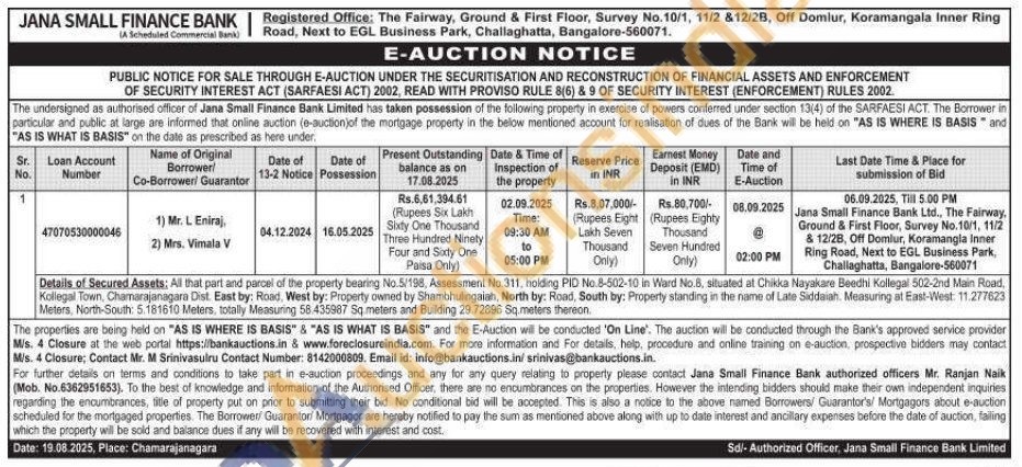 All that part and parcel of the property bearing No.5/198, Assessment No.311, holding PID No.8-502-10 in Ward No.8, situated at Chikka Nayakare Beedhi Kollegal 502-2nd Main Road, Kollegal Town, Chamarajanagara Dist. East by: Road, West by: Property owned by Shambhulingaiah, North by: Road, South by: Property standing in the name of Late Siddaiah. Measuring at East-West: 11.277623 Meters, North-South: 5.181610 Meters, totally Measuring 58.435987 Sq meters and Building 29.72896 Sq. meters thereon