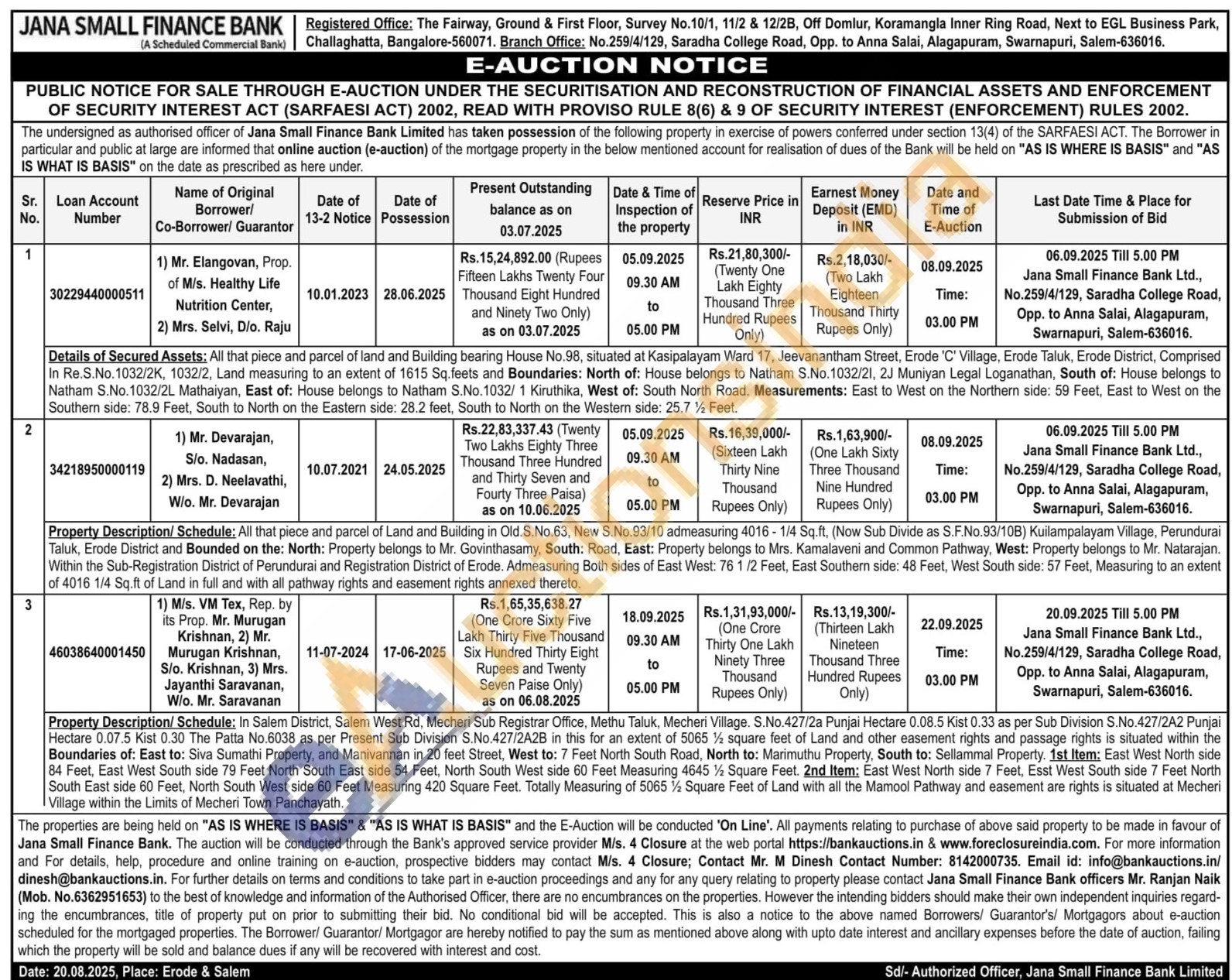 Details of Secured Assets: All that piece and parcel of land and Building bearing House No.98, situated at Kasipalayam Ward 17, Jeevanantham Street, Erode 'C' Village, Erode Taluk, Erode District, Comprised In Re.S.No. 1032/2K, 1032/2, Land measuring to an extent of 1615 Sq.feets and Boundaries: North of: House belongs to Natham S.No.1032/21, 2J Muniyan Legal Loganathan, South of: House belongs to Natham S.No.1032/2L Mathaiyan, East of: House belongs to Natham S.No. 1032/ 1 Kiruthika, West of: South North Road. Measurements: East to West on the Northern side: 59 Feet, East to West on the Southern side: 78.9 Feet, South to North on the Eastem side: 28.2 feet, South to North on the Western side: 25.7 1/2 Feet