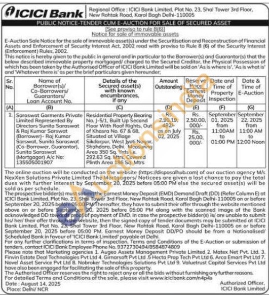 Residential Property Bearing No. J-5/1, Built Up Second Floor With Roof Rights, Out of Khasra No. 67 & 68 Situated at Village Sikdarpur, West Jyoti Nagar. Shahdara, Delhi. Measuring Area 350 Sq. Yrds ie. 292.63 Sq. Mtrs, Covered Plinth Area 186 Sq. Mtrs