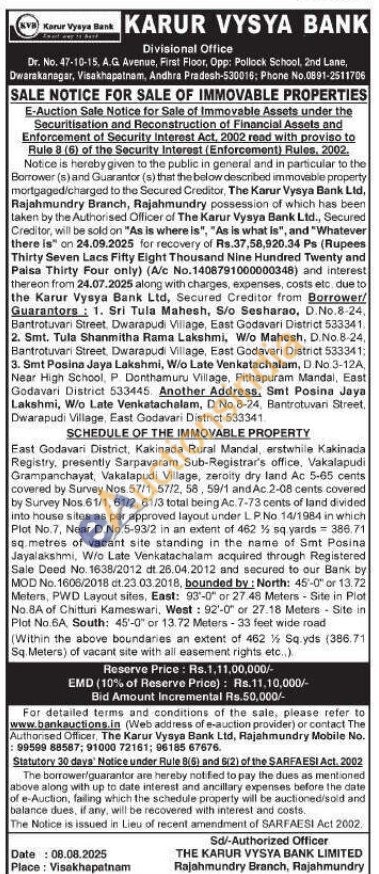 East Godavari District, Kakinada Rural Mandal, erstwhile Kakinada Registry, presently Sarpavaram Sub-Registrar's office, Vakalapudi Grampanchayat, Vakalapudi Village, zeroity dry land Ac 5-65 cents covered by Survey Nos. 57/1, 57/2, 58, 59/1 and Ac 2-08 cents covered by Survey Nos 61/1, 61/2, 61/3 total being Ac. 7-73 cents of land divided into house sites as per approved layout under L. P. No 14/1984 in which Plot No. 7, Near D.No.5-93/2 in an extent of 462 % sq yards 386.71 sq metres of vacant site standing in the name of Smt Posina Jayalakshmi, Wio Late Venkatachalam acquired through Registered Sale Deed No. 1638/2012 dt. 26.04.2012 and secured to our Bank by MOD No. 1608/2018 dt. 23.03.2018, bounded by: North: 45-0 or 13.72 Meters, PWD Layout sites, East: 93-0" or 27.48 Meters - Site in Plot No.BA of Chittun Kameswari, West: 92-0" or 27.18 Meters - Site in Plot No.6A, South: 45-0 or 13.72 Meters-33 feet wide road(Within the above boundaries an extent of 462 % Sq.yds (386.71 Sq. Meters) of vacant site with all easement rights etc..)