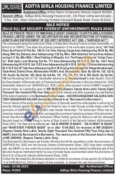 All That Piece And Parcel Of Flat No. 108 On 1st Floor Having Carpet Area Admeasuring 48.48 Sq. Mtr Along With Dry Balcony Area Admeasuring 3.20 Sq. Mtrs. With Attached Terrace Area Admea-suring 5.11 Sq. Mtrs With 1 Shed Parking In Wing No. A In The Project Known As "Urban Coun-try" Built Upon Land Bearing Gat No. 131 Area Admeasuring 00 H 12 R, Gat No. 132/1 Areal Admeasuring 00 H28 R, Gat 132/2 Area Admeasuring 00 H.25 R, Gat No. 133 Area Admeasuring 00 H 19 R Out Of Total Area Admeasuring 00 H 39 R Lying And Situated At Village-Nanekarwadi, Taluk-Khed, District-Pune, Maharashtra-410501