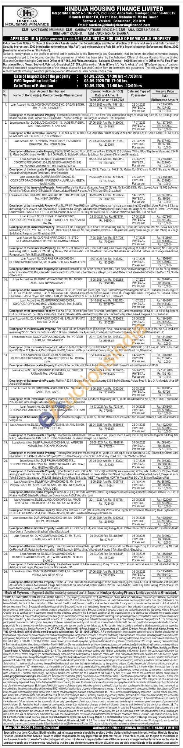 Description of the Immovable Property: Flat No. FF-04 (Rear RHS) on 1st Floor without roof rights area measuring 360 sqft Built Upon Plot No. B73 area measuring 200 sqydsvide part of Khasra No. 224 situated at Village Sadullabad Rail Vihar SahkariAwas Samiti Lid Paragna Loni Tehsil and District Ghaziabad, Uttar Pradesh. EAST-FiatNo.FF-03, WEST-Plot No.B-72, NORTH-Entry of Flat RatNo. FF-01/Road 25ftWide, SOUTH- Plot No. B-46