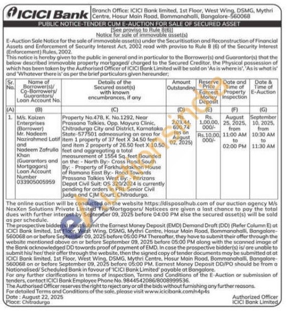 Property No.478, K. No.1292, Near Prassana Talkies. Opp. Mayura Clinic, Chitradurga City and District, Karnataka Stute-577501 admeasuring an area for item 1 property of 37 feet X 34.50 feet and item 2 property of 26.50 feet X 10.50 feet and aggregating a total measurement of 1554 Sq. feet Bounded on the North By:- Cross Road South By: Property of Farkhundakhan House of Ramana East By:- Road Towards Prassana Talkies West By:- Parizans Depot Civil Suit: OS 320/2024 is currently pending for orders in PRL. Senior Civil Judge and CJM Court, Chitradurga.