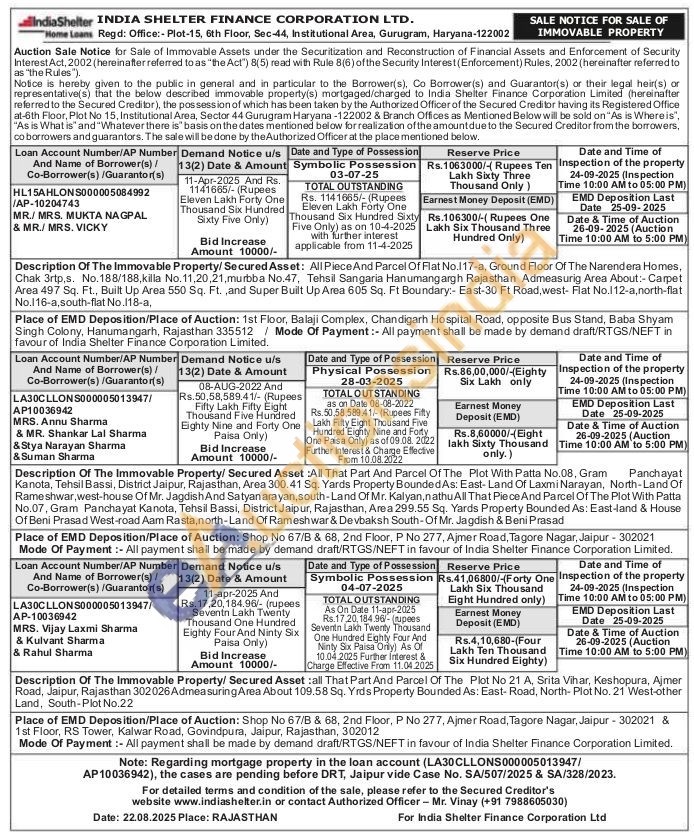Description Of The Immovable Property/Secured Asset: All Piece And Parcel Of Flat No.117-a, Ground Floor Of The Narendera Homes, Chak 3rtp.s. No. 188/188, killa No.11,20,21,murbba No.47, Tehsil Sangaria Hanumangargh Rajasthan Admeasurig Area About:- Carpet Area 497 Sq. Ft., Built Up Area 550 Sq. Ft., and Super Built Up Area 605 Sq. Ft Boundary:- East-30 Ft Road,west- Flat No.112-a, north-flat No.116-a,south-flat No.118-a,