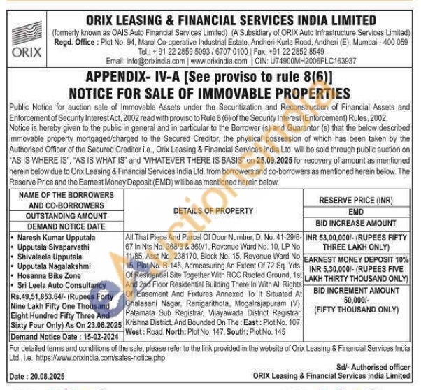 All That Piece And Parcel Of Door Number, D. No. 41-29/6-67 In Nts No. 368/3 & 369/1, Revenue Ward No. 10, LP No. 11/85, Asst No. 238170, Block No. 15, Revenue Ward No. 15, Plot No. B-145, Admeasuring An Extent Of 72 Sq. Yds. Of Residential Site Together With RCC Roofed Ground, 1st And 2nd Floor Residential Building There In With All Rights Of Easement And Fixtures Annexed To It Situated At Chalasani Nagar, Ranigarithota, Mogalrajapuram (V). Patamata Sub Registrar, Vijayawada District Registrar, Krishna District, And Bounded On The East: Plot No. 107, West: Road, North: Plot No. 147, South: Plot No. 145