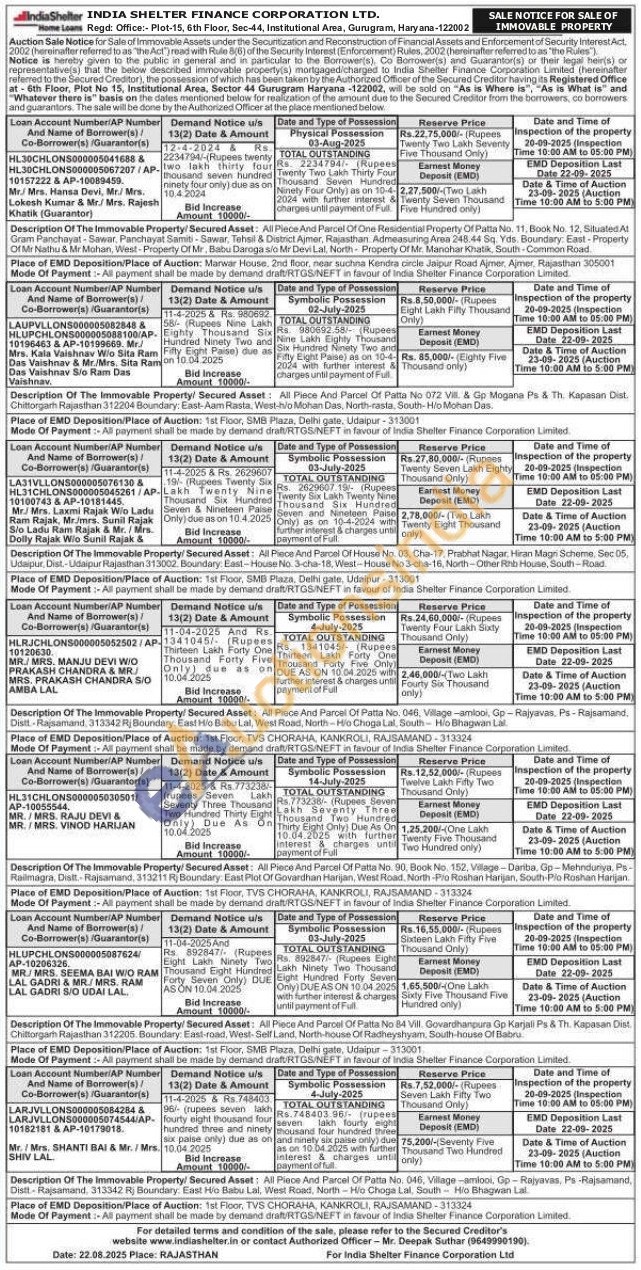 Description Of The Immovable Property/Secured Asset: All Piece And Parcel Of One Residential Property Of Patta No. 11, Book No. 12, Situated At Gram Panchayat-Sawar, Panchayat Samiti-Sawar, Tehsil & District Ajmer, Rajasthan Admeasuring Area 248.44 Sq. Yds. Boundary: East-Property Of Mr Nathu & Mr Mohan, West-Property Of Mr. Babu Daroga s/o Mr Devi Lal, North Property Of Mr. Manohar Khatik, South-Common Road.