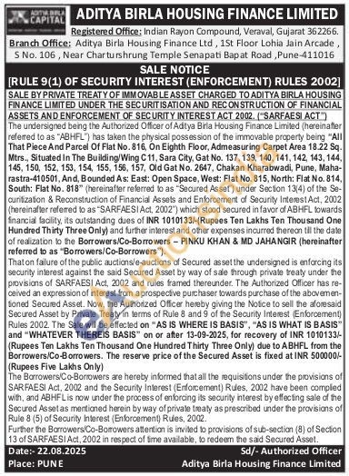 "All That Piece And Parcel Of Flat No. 816, On Eighth Floor, Admeasuring Carpet Area 18.22 Sq. Mtrs., Situated In The Building/Wing C 11, Sara City, Gat No. 137, 139, 140, 141, 142, 143, 144, 145, 150, 152, 153, 154, 155, 156, 157, Old Gat No. 2647, Chakan Kharabwadi, Pune, Maha-rastra-410501, And, Bounded As: East: Open Space, West: Flat No. 815, North: Flat No. 814, South: Flat No. 818