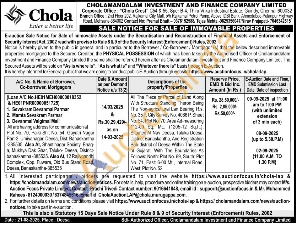 All The Piece or Parcel of Land Along With Structure Standing Theron Being The Non-agricultural Lan Bearing R.s. No. 35 P, City Survey No. 4066 P, Sheet No. 54, Plot No. 70, Area Ad-measuring 112-00 Sq. Mt., (1205-12 Sq.ft.), Situated At Nav Deesa, Taluka Deesa, District Banaskantha, And Registration Sub-district of Deesa Within The State of Gujarat. With The Boundaries As Follows: North: Plot No. 69, South: Plot No. 71, East: 6-00 Mt., Internal Road, West: Plot No. 52