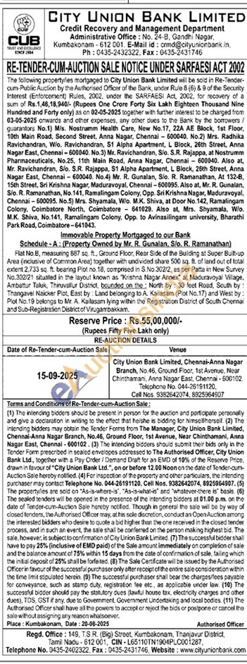 Immovable Property Mortgaged to our Bank Schedule-A: (Property Owned by Mr. R. Gunalan, S/o. R. Ramanathan) : Flat No.B, measuring 887 sq. ft., Ground Floor, Rear Side of the Building at Super Built-up Area (inclusive of Common Area) together with undivided share 500 sq. ft. of land out of total extent 2,733 sq. ft. bearing Plot no.18, comprised in S.No.302/2, as per Patta in New Survey No.302/21 situated in the layout known as "Krishna Nagar Annex" at Maduravoyal Village. Ambattur Taluk, Thiruvallur District, bounded on the North by: 30 feet Road, South by: Thangavel Naicker Plot, East by: Land belonging to A. Kailasam (Plot No.17) and West by: Plot No.19 belongs to Mr. A. Kailasam lying within the Registration District of South Chennai and Sub-Registration District of Virugambakkam
