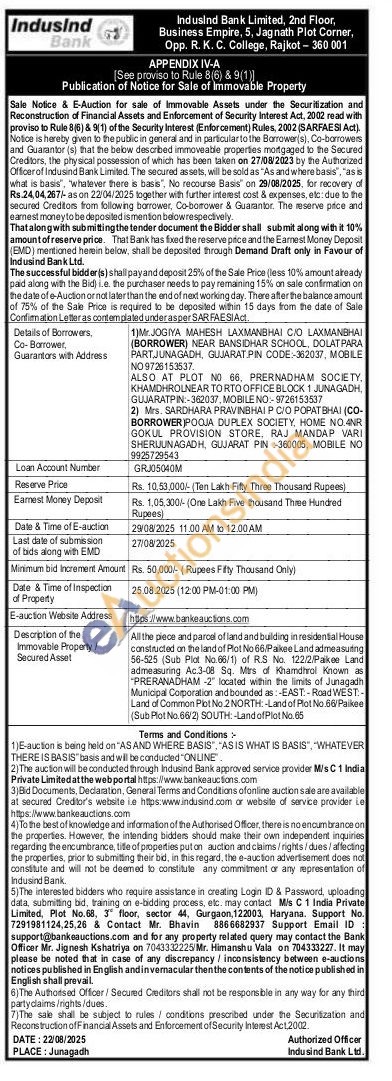 All the piece and parcel of land and building in residential House constructed on the land of Plot No 66 Pakee Land admeasuring 56-525 (Sub Plot No.66/1) of RS No. No 122/2/Pakee Land admeasuring Ac.3-08 Sq. Mtrs of Khamdhrol Known as PRERANADHAM -2 located within the limits of Junagadh Municipal Corporation and bounded as: -EAST-Road WEST-Land of Common Plot No.2 NORTH-Land of Plot No.66/Paikee (Sub Plot No.66/2) SOUTH-Land of Plot No.65