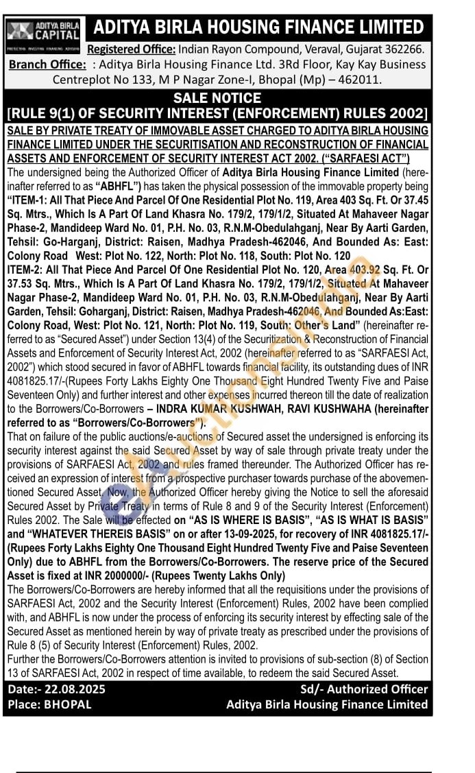 "ITEM-1: All That Piece And Parcel Of One Residential Plot No. 119, Area 403 Sq. Ft. Or 37.45 Sq. Mtrs., Which Is A Part Of Land Khasra No. 179/2, 179/1/2, Situated At Mahaveer Nagar Phase-2, Mandideep Ward No. 01, P.H. No. 03, R.N.M-Obedulahganj, Near By Aarti Garden, Tehsil: Go-Harganj, District: Raisen, Madhya Pradesh-462046, And Bounded As: East: Colony Road West: Plot No. 122, North: Plot No. 118, South: Plot No. 120 ITEM-2: All That Piece And Parcel Of One Residential Plot No. 120, Area 403.92 Sq. Ft. Or 37.53 Sq. Mtrs., Which Is A Part Of Land Khasra No. 179/2, 179/1/2, Situated At Mahaveer Nagar Phase-2, Mandideep Ward No. 01, P.H. No. 03, R.N.M-Obedulahganj, Near By Aarti Garden, Tehsil: Goharganj, District: Raisen, Madhya Pradesh-462046, And Bounded As: East: Colony Road, West: Plot No. 121, North: Plot No. 119, South: Other's Land