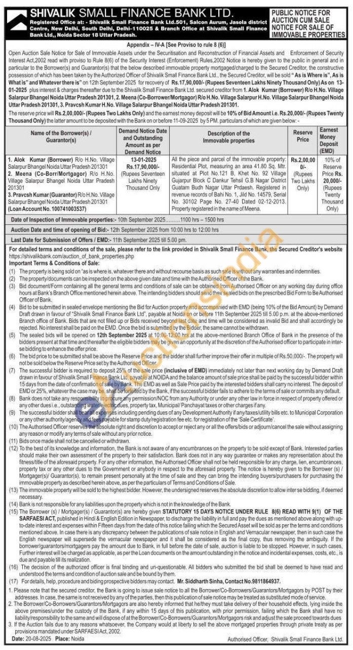 All the piece and parcel of the immovable property: Residential Plot, measuring an area 41.80 Sq. Mr. situated at Plot No.121 B. Khet No. 92 Village Gujarpur Block C Danikur Tehsil G.B. Nagar District Guatam Budh Nagar Uttar Prdaesh. Registered in revenue records of Bahi No. 1, Jild No. 14579, Serial No. 30102 Page No. 27-40 Dated 02-12-2013. Property registered in the name of Meena