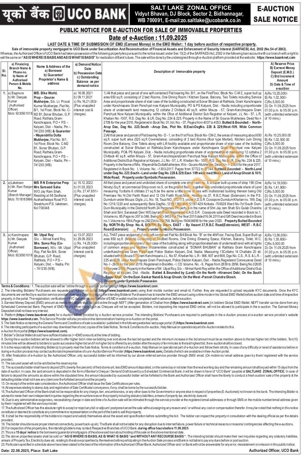 ALL THAT piece andparcel of one self-contained Flat No. B/4 Block No- "B' on the 4th Floor, Facing East, Super Built up area 850 sq.ft. (Marble) Consisting of TwoBed Rooms, One Dining/Drawing Spaca, Kitchen, Balcony, Toilet, W.C. including proportionate share of stair case of the building along with proportionateshare of underneath land with all rights of common areas and facilities andamenities constructed at "SONAR BHUBAN at Rathtala Gram Kanchrapara underKanchrapara Gram Panchayet Police Station Kalyani, Dist. Nadia. Measuring 13Cottahs 14 Chattaks 20 stt. situated within Mouza 57 Gram Kanchrapara J.L. No.57, Khatian No.LR-906,907 and 908, Dga No. C.S., R.S. & L.R.-225 and226, under Kanchrapara Gram Panchayet, Police Station Kalyani, Dist.-Nadia. Registered Conveyance Deed No-1-2605 for the year 2019, Registered in BookNo.-I, CD Volume. No. -6, Pages from 2839 to 2856. Being No.02605 for theyear 2009. Property in the Name of Mr. Utpal Roy. Sio.-Mrinal Kanti Roy within the Office of Additional District Sub Registrar at Kalyani, Dist. Nadia. Butted & Bounded by (Land):-On the North-Hiramoni Debi; On the South -Bager Khal; On the East-Sankar Nandi & Anup Ghosh; On the West-Paresh Chandra Ghosh. Property under Symbolic Possession.