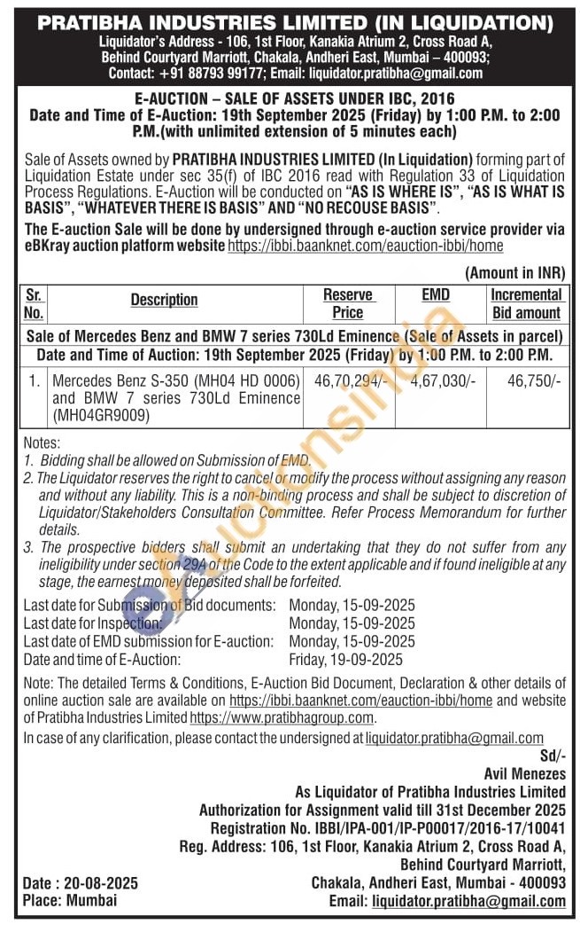 Contact: +91 88793 99177; Email: liquidator.pratibha@gmail.com