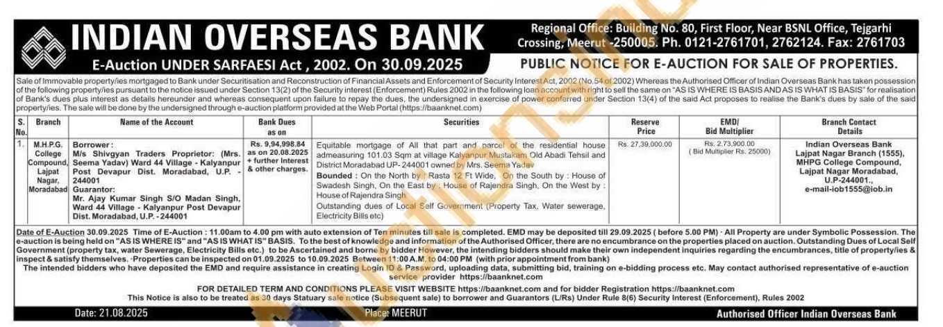 Equitable morigage of All that part and parcel of the residential house admeasuring 101.03 Sqm at village Kalyanpur Mustakam Old Abadi Tehsil and District Moradabad UP-244001