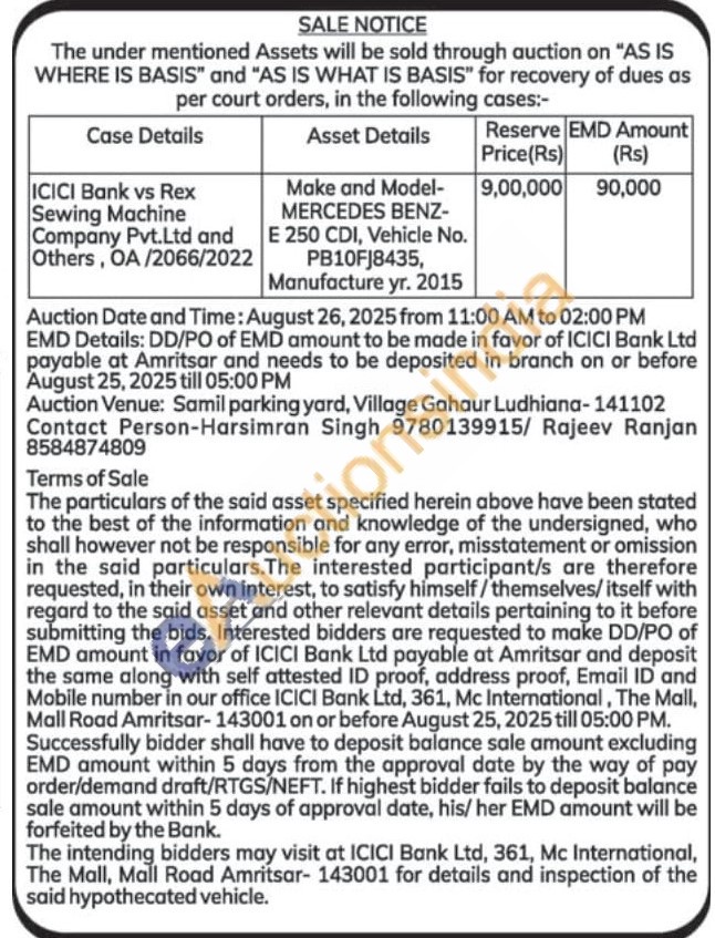 Make and Model-MERCEDES BENZ-E 250 CDI, Vehicle No. PB10FJ8435, Manufacture yr. 2015