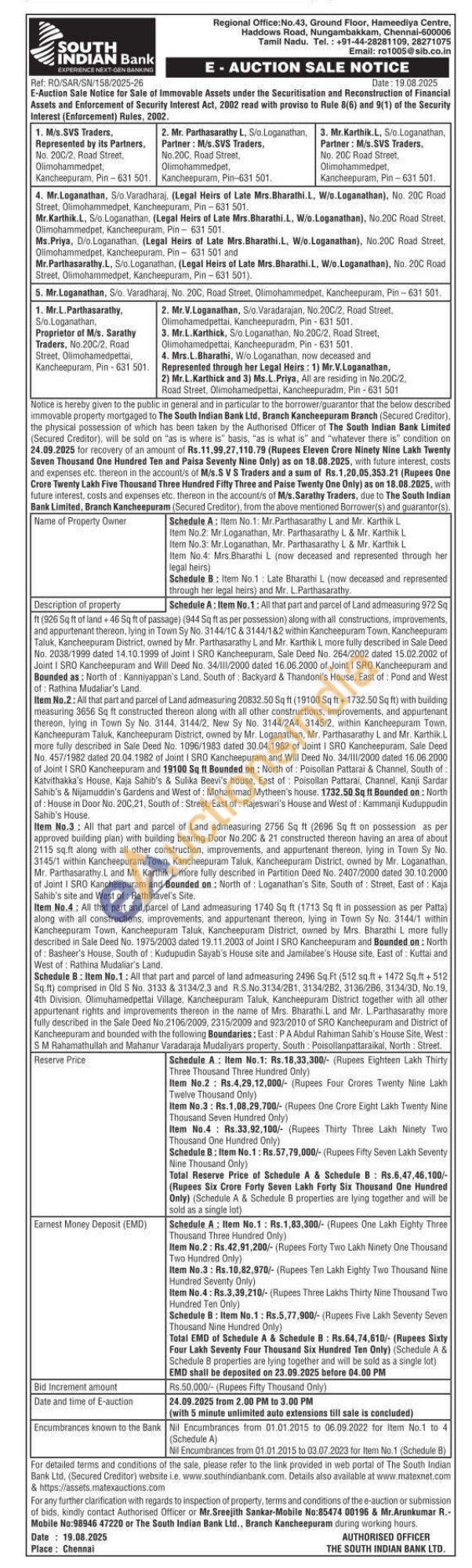 Item No.3: All that part and parcel of Land admeasuring 2756 Sq ft (2696 Sq ft on possession as per approved building plan) with building bearing Door No.20C & 21 constructed thereon having an area of about 2115 sq.ft along with all other construction, improvements, and appurtenant thereon, lying in Town Sy No. 3145/1 within Kancheepuram Town, Kancheepuram Taluk, Kancheepuram District, owned by Mr. Loganathan, Mr. Parthasarathy. L. and Mr. Karthik L. more fully described in Partition Deed No. 2407/2000 dated 30.10.2000 of Joint I SRO Kancheepuram and Bounded on: North of Loganathan's Site, South of Street, East of: Kaja Sahib's site and West of: Rathinavel's Site.