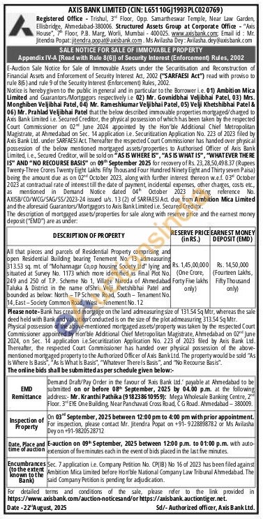 All that pieces and parcels of Residential Property comprising and open Residential Building bearing Tenement No. 13 admeasuring 313.53 sq. mt of "Mohannagar Co,op housing Society Ltd" lying and situated at Survey No. 1173 which more identified as Final Plot No 249 and 250 of T.P. Scheme No 1, Village Naroda of Ahmedabad Taluka & District in the name of Shri. Velji Khetshibhai Patel and bounded as below: North-TP Scheme Road, South-Tenament No 14, East-Society Common Road, West-Tenement No. 12