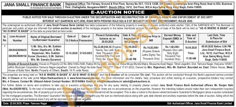 Details of Secured Assets: House on Property LD No. 385c1400u1048, Rakba 95 Sq.yards, situated at Waka Mouja Munda Majra, Mousuma Azad Nagar, Tehsil Jagadhri, Dist Yamuna Nagar, Haryana-135001, within Muncipal Corporation Yamuna Nagar-Jagadhari. Owned by Regd No.Sale Deed No. 12771 Dated 17-01-2022, Owned by Mrs. Rajeshvari, W/o. Mr. Sukhvir. Bounded as: East: Others House, West: House of Balla Ram, North: Property of Others, South: 18 Ft. wide Rasta.