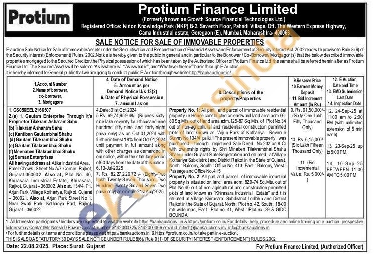 Property No. 1: All part and parcel of immovable residential property ie House constructed on eastward land area adm 66-80 Sq.Mts. out of land area adm. 125-87 Sq.Mts. of Plot No.34 out of non-agricultural and residential construction permitted plots of land known as "Arjun Park of Kothariya Revenue Survey No 134/4 paiki 1 The present immovable property was purchased through registered Sale Deed No.232 on 8 Cr with ownership rights by Shri Minaben Tilakrambhai Shahu Shahu under Gujarat State Registration and situated at Village Kothariya Subdistrict and District Rajkot in the State of Gujarat North Balcony, South Office No. 413. East: Balcony, West Passage and Office No.415
