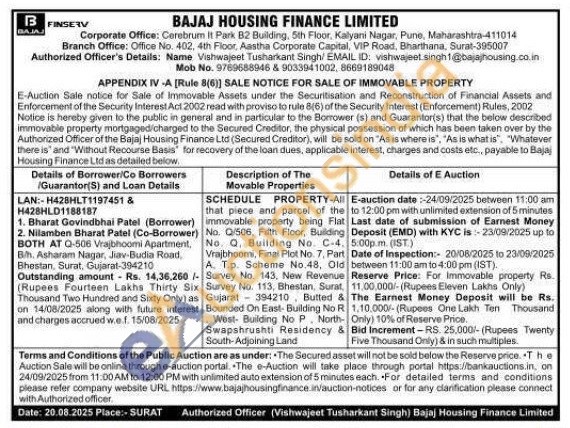 PROPERTY-All that piece and parcel of the immovable property being Flat No. 0/506, Fifth Floor, Building No. Q, Building No. C-4. Vrajbhoomi, Final Plot No. 7, Part A. Tp. Scheme No.48, Old Survey No. 143, New Revenue Survey No. 113, Bhestan. Surat Gujarat 394210 Butted & Bounded On East Building No R West Building No P. North Swapshrushti Residency & South-Adjoining Land