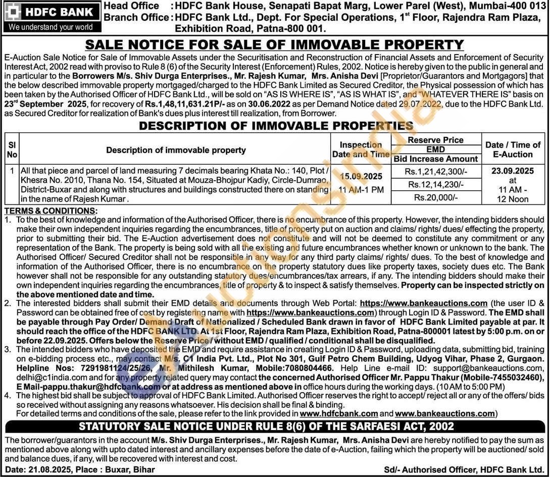 All that piece and parcel of land measuring 7 decimals bearing Khata No.: 140, Plot/Khesra No. 2010, Thana No. 154, Situated at Mouza-Bhojpur Kadiy, Circle-Dumrao, District-Buxar and along with structures and buildings constructed there on standing in the name of Rajesh Kumar
