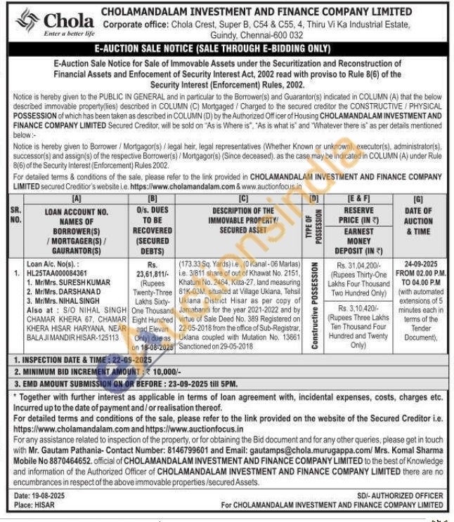 (173.33 Sq. Yards) ie, (0 Kanal-06 Marlas) le 3/811 share of out of Khawat No. 2151, Khatuni No. 2464, Kitta-27, land measuring 81K-03M, situated at Village Uklana, Tehsil Uklana District Hisar as per copy of Jamabandi for the year 2021-2022 and by virtue of Sale Deed No. 389 Registered on 22-05-2018 from the office of Sub-Registrar, Uklana coupled with Mutation No. 13661 Sanctioned on 29-05-2018