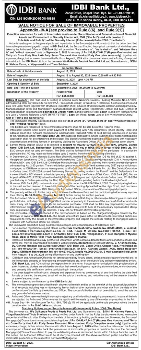 Shri D. V. Krishna Reddy. Dy. General Manager and Authorised Officer Telephone No : +91-4067694111 / Shri Ganesh Gedam AGM Retail Recovery Dept Telephone No : +91-4066746030 / Mobile No : 9999362361