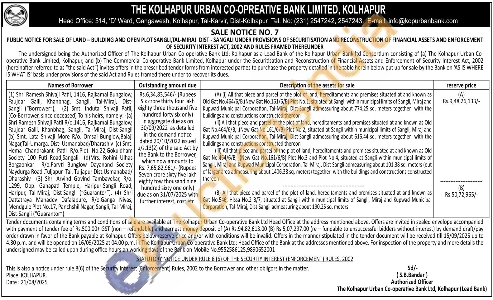 (ii) All that piece and parcel of the plot of land, hereditaments and premises situated at and known as Old Gat No.464/6/B,, (New Gat No.161/6/B) Plot No.2, situated at Sangli within municipal limits of Sangli, Miraj and Kupwad Municipal Corporation, Tal-Miraj, Dist-Sangli admeasuring about 616.44 sq. meters together with the buildings and constructions constructed thereon