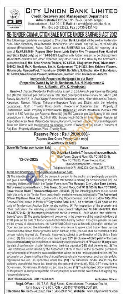 Vacant Residential Plot to a total extent of 5.30 Ares (As per Revenue Records) and (16.250 Cents as per Old Survey in Tittle Deed description) in Re-Survey No.344/18 (Old Survey No.244/2-8) in Sree Nagar Residential Association Area, Near Melamcodu Temple, Karumom. Nemom Village, Thiruvananthapuram Taluk and District with the following boundaries North Thakidy Road, South Property of Sundaran, East Property of Prabhakaran, West: Property of Prabhakaran. Item No.2: Vacant Residential Plot to a total extent of 5.50 Ares (As per Revenue Records) (16.250 Cents as per Old Survey in title deed description) in Re-Survey No.344/8 (Old Survey No.244/2-3) in Sree Nagar Residential Association Area, Near Melamcodu Temple, Karumom, Nemom Village, Thiruvananthapuram Taluk and District with the following boundaries, North Property of Raj, South: Property of Raj, East: Property of Manian, West: Thakidy Road.