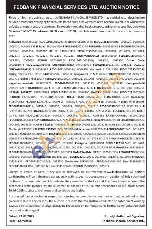 Fedbank Financial Services Ltd Gold Auctions Auction in Dharwad