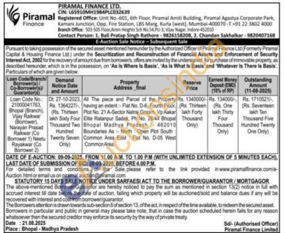 All The piece and Parcel of the Property , having an extent:-Flat No. D-6, Fourth Floor Plot No. 21 A-Sector Natraj Gnssm, Vp Aakar Four Elite Ratanpur Sadak, Ph No. 26/44 Bhopal Two Bhopal Madhya Pradesh 462010 Boundaries As North Open Plot South Common Area East: Plat No. D-05 West Common Area