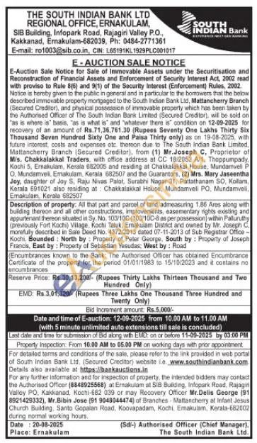 All that part and parcel of land admeasuring 1.56 Ares along with building thereon and all other constructions, improvements, easementary rights existing and appurtenant thereon situated in Sy. No. 103/100 (103/10C-8 as per possession) within Paluruthy (previously Fort Kochi) Village, Kochi Taluk, Ermahulam District and owned by Mr. Joseph C morefully described in Sale Deed No. 4372/2013 dated 07-11-2013 of Sub Sub Registrar Office-Kochi. Bounded: North by Property of Peter George, South by: Property of Joseph Francis, East by: Property of Sebastian Yesudas: West by: Road