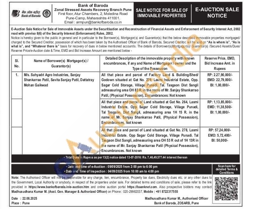 All that piece and parcel of Factory Land & Building/Shed/Godown situated at Gat No. 279, Laxmi Industrial Estate, Opp. Sagar Cold Storage, Village Punadi, Tal. Tasgaon Dist Sangli admeasuring area OH 83 R. in the name of Mr. Sanjay Shankarrao Patil, (Physical Possession), Encumbrances: Not known