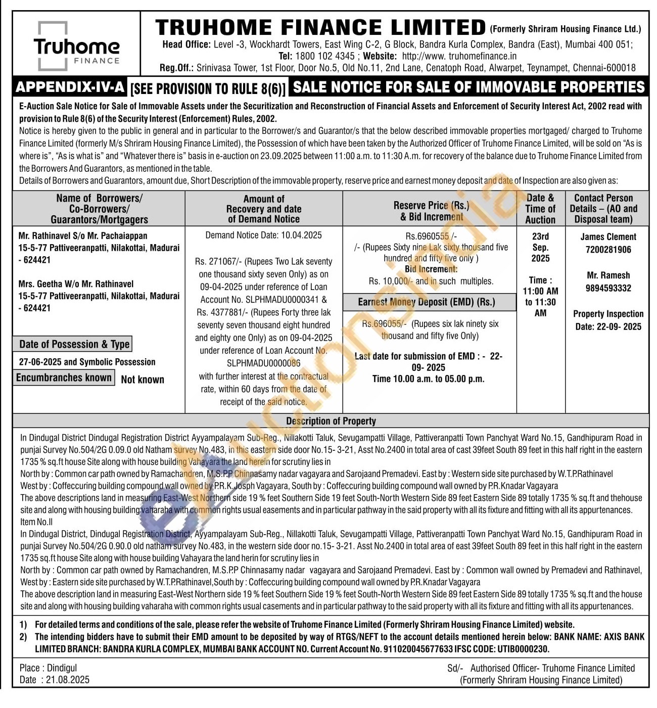 In Dindugal District Dindugal Registration District Ayyampalayam Sub-Reg., Nillakotti Taluk, Sevugampatti Village, Pattiveranpatti Town Panchyat Ward No. 15, Gandhipuram Road in punjai Survey No.504/2G 0.09.0 old Natham survey No.483, in this eastern side door No.15-3-21, Asst No.2400 in total area of cast 39feet South 89 feet in this half right in the eastern 1735% sq.ft house Site along with house building Vahayara the land herein for scrutiny lies in North by: Common car path owned by Ramachandren, M.S.P.P Chinnasamy nadar vagayara and Sarojaand Premadevi. East by: Western side site purchased by W.T.P.Rathinavel West by: Coffeccuring building compound wall owned by P.R.K.Josph Vagayara, South by: Coffeccuring building compound wall owned by P.R.Knadar Vagayara The above descriptions land in measuring East-West Northern side 19% feet Southern Side 19 feet South-North Western Side 89 feet Eastern Side 89 totally 1735% sq.ft and thehouse site and along with housing building vaharaha with common rights usual easements and in particular pathway in the said property with all its fixture and fitting with all its appurtenances. Item No.Il In Dindugal District, Dindugal Registration District, Ayyampalayam Sub-Reg., Nillakotti Taluk, Sevugampatti Village, Pattiveranpatti Town Panchyat Ward No.15, Gandhipuram Road in punjai Survey No.504/2G 0.90.0 old natham survey No.483, in the western side door no.15-3-21. Asst No.2400 in total area of east 39feet South 89 feet in this half right in the eastern 1735 sq.ft house Site along with house building Vahayara the land herin for scrutiny lies in North by: Common car path owned by Ramachandren, M.S.P.P Chinnasamy nadar vagayara and Sarojaand Premadevi. East by: Common wall owned by Premadevi and Rathinavel, West by: Eastern side site purchased by W.T.P.Rathinavel, South by: Coffeccuring building compound wall owned by P.R.Knadar Vagayara The above description land in measuring East-West Northern side 19% feet Southern Side 19% feet South-North Western Side 89 feet Eastern Side 89 totally 1735% sq.ft and the house site and along with housing building vaharaha with common rights usual casements and in particular pathway to the said property with all its fixture and fitting with all its appurtenances