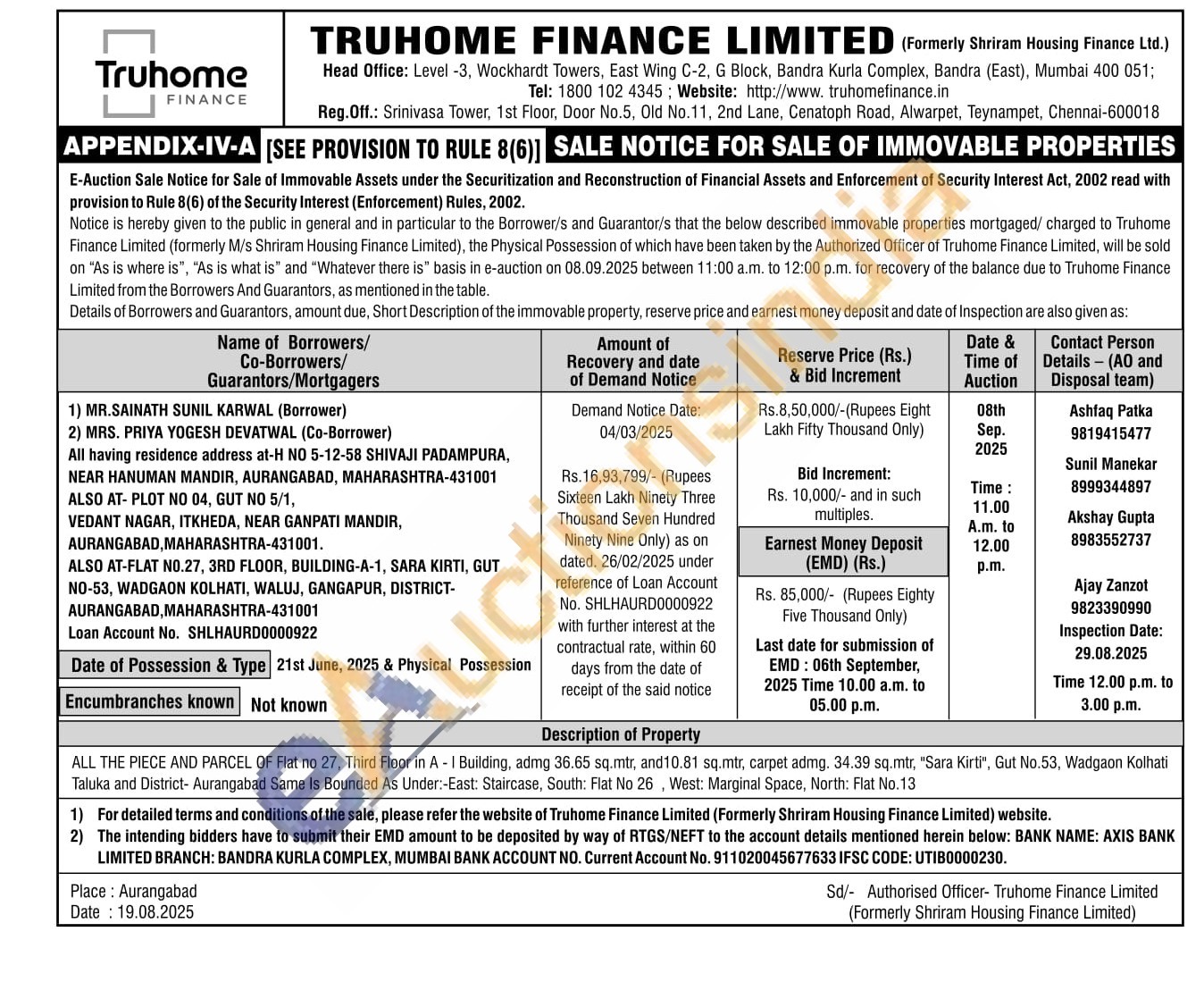 ALL THE PIECE AND PARCEL OF Flat no 27, Third Floor in A - I Building, admg 36.65 sq.mtr, and10.81 sq.mtr, carpet admg. 34.39 sq.mtr, "Sara Kirti", Gut No.53, Wadgaon Kolhati Taluka and District- Aurangabad Same Is Bounded As Under:-East: Staircase, South: Flat No 26, West: Marginal Space, North: Flat No. 13