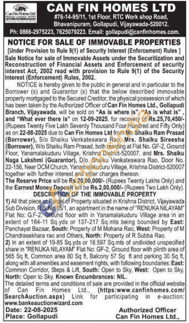 Contact VijayawaPh: 0866-2975223, 7625079223. Email: gollapudi@canfinhomes.comda-520012. Ph