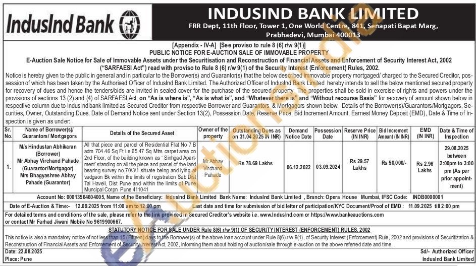 All that Piece & parcel of Residential Flat No 7 B adm 704.46 Sq Ft i.e 65.47 Sq Mtrs carpet area on 2nd Floor, of the building known as Sinhgad Apart-ment standing on all the piece and parcel of the land bearing survey no 70/3/1 situate being and lying at vadgaon Bk within the limits of registration Sub Dist Tal Haveli, Dist Pune and within the limits of Pune Muncipal Corpn Pune 411041