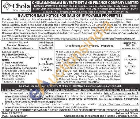 All that piece and parcel of land and building in In Thiruvarur Revenue District, Thiruvrur Registration District, Valangaiman Sub Registration, Valangaiman Vattam, 30. Avur Village, Saluvambettal Sub Village, Saluvampettal Main Road, Northem side, comprised in Old R.S.No.281A, New R.S.No.281A/15 measuring in the extent of East to West 21 feet, South to North 153 feet. Thus the total extent of 3213 Square feet (298.49 Square meter) with Door No.4/73, (New Door No.4/198), E.B.Connection No 70. Boundaries: East by Sabura Begam House Backyard, West by Mohamed Batcha House, South by Saluvampettai Main Road, North by Indhra Ammal Vacant Plot