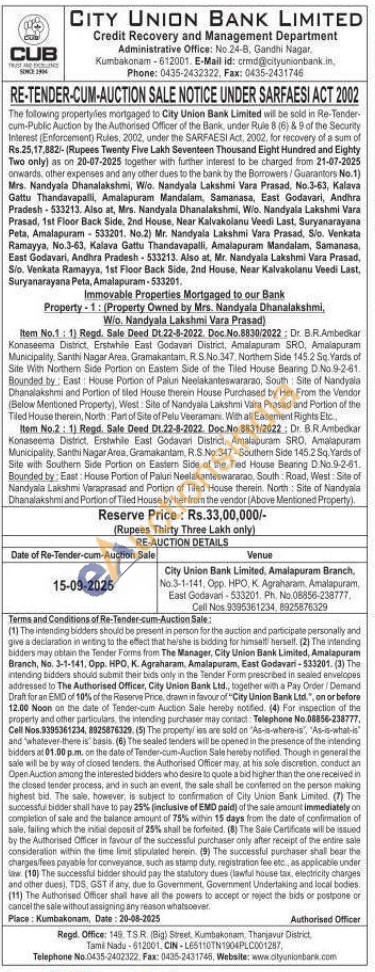 Item No.2: 1) Regd. Sale Deed Dt.22-8-2022. Doc. No.8831/2022: Dr. B.R.Ambedkar Konaseema District. Erstwhile East Godavari District, Amalapuram SRO, Amalapuram Municipality, Santhi Nagar Area, Gramakantam, R.S.No.347-Southern Side 145.2 Sq. Yards of Site with Southern Side Portion on Eastern Side of the Tied House Bearing D.No.9-2-61. Bounded by: East: House Portion of Paluri Neelakanteswararao, South Road, West: Site of Nandyala Lakshmi Varaprasad and Portion of Tiled House therein. North: Site of Nandyala Dhanalakshmi and Portion of Tiled House by her from the vendor (Above Mentioned Property)