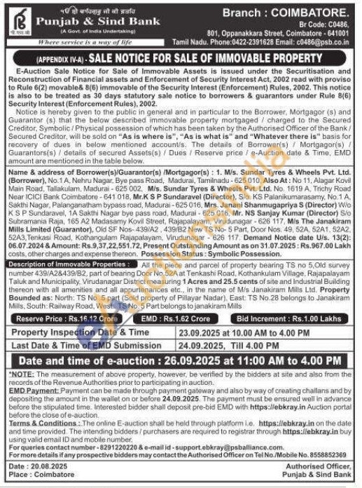 All the piece and parcel of property bearing TS no 5, Old survey number 439/A2&439/B2, part of bearing Door No.52A at Tenkashi Road, Kothankulam Village, Rajapalayam Taluk and Municipality, Virudanagar District measuring 1 Acres and 25.5 cents of site and Industrial Building thereon with all amenities and all appurtenances etc., in the name of M/s Janakiram Mills Ltd. Property Bounded as: North: TS No 5 part (Sold property of Pillayar Nadar), East: TS No.28 belongs to Janakiram Mills, South. Railway Road, West: TS No. 5 Part belongs to janakiram Mills