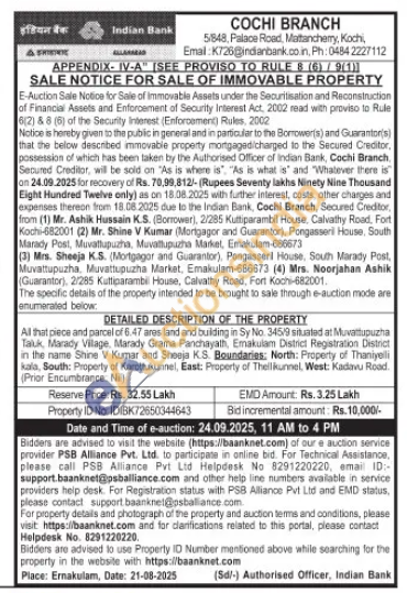 All that piece and parcel of 6.47 ares land and building in Sy No. 345/9 situated at Muvattupuzha Tauk, Marady Village, Marady Grama Panchayath, Emakulam District Registration District in the name Shine V Kumar and Sheeja K.S. Boundaries: North: Property of Thaniyel kala, South: Property of Karoltukunnel East: Property of Thellkunnel, West: Kadavu Road Prior Encumbrance: Ni