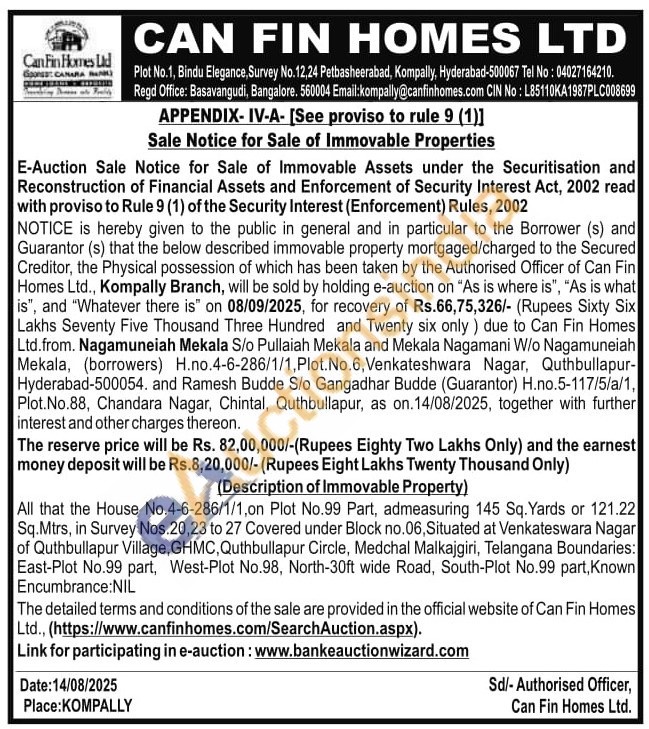 (Description of Immovable Property) : All that the House No.4-6-286/1/1,on Plot No.99 Part, admeasuring 145 Sq. Yards or 121.22 Sq.Mtrs, in Survey Nos. 20,23 to 27 Covered under Block no.06, Situated at Venkateswara Nagar of Quthbullapur Village, GHMC, Quthbullapur Circle, Medchal Malkajgiri, Telangana Boundaries: East-Plot No.99 part, West-Plot No.98, North-30ft wide Road, South-Plot No.99